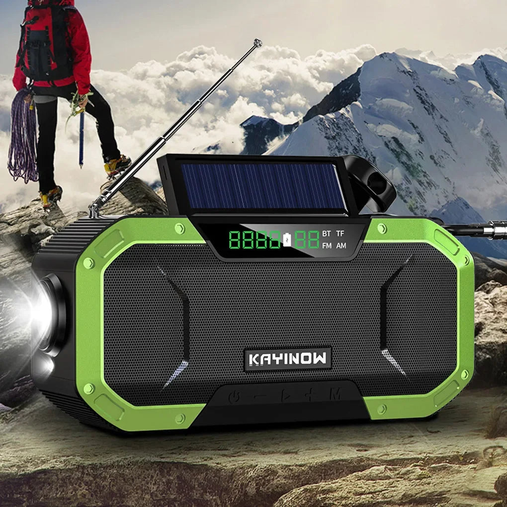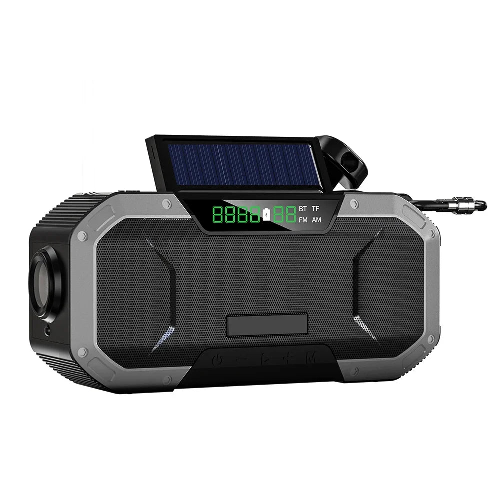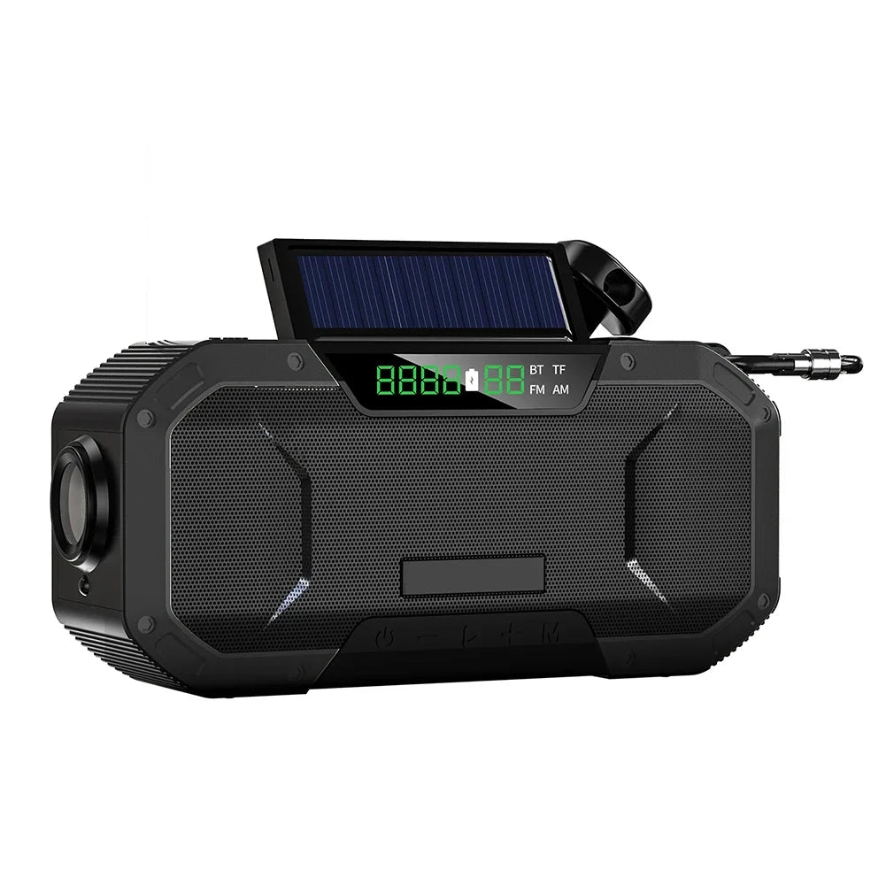 Multifunctional Portable Bluetooth-Compatible Speaker Hand Crank Solar Radio AM/FM Outdoor Emergency Radio LED Flashlight and 5000mAh Power Bank IPX5 Waterproof Main selling point: With Bluetooth-compatible speaker function, beautiful sound quality Comes with hand-crank generator, solar charging With radio function, automatic search station 5000mAh capacity battery for charging mobile devices With flashlight function With reading night light function With SOS alarm function With compass function With dual power protection Portable and durable IPX5 waterproof
