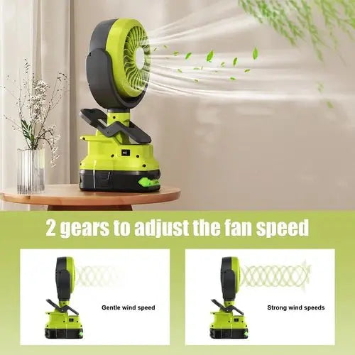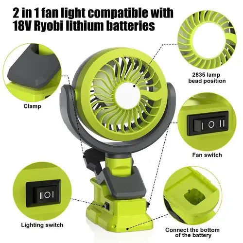 Meet the Adventurous Portable Camping Fan with LED Light — the ultimate 2-in-1 companion that cools fast and lights your surroundings for any outdoor adventure. Powered by a Ryobi 18V lithium-ion battery, this compact device delivers refreshing airflow and bright illumination wherever you roam, from camping trips and festivals to backyard tasks.