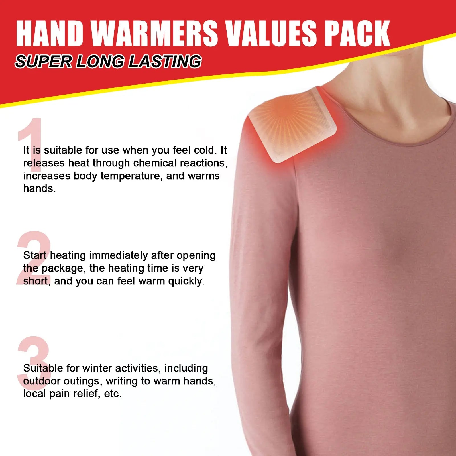 Our hand warmer (20pcs) contains sodium chloride and vermiculite. It can release heat, raise body temperature and warm hands. Its usage method is very simple: 1. After opening the package, take out the patch and stick it inside the clothes. The patch will start heating within 15 to 30 minutes. The heat preservation effect can last for 10 hours. And it can be applied to winter activities, including outdoor outings, writing warm handwriting, local pain relief, etc.