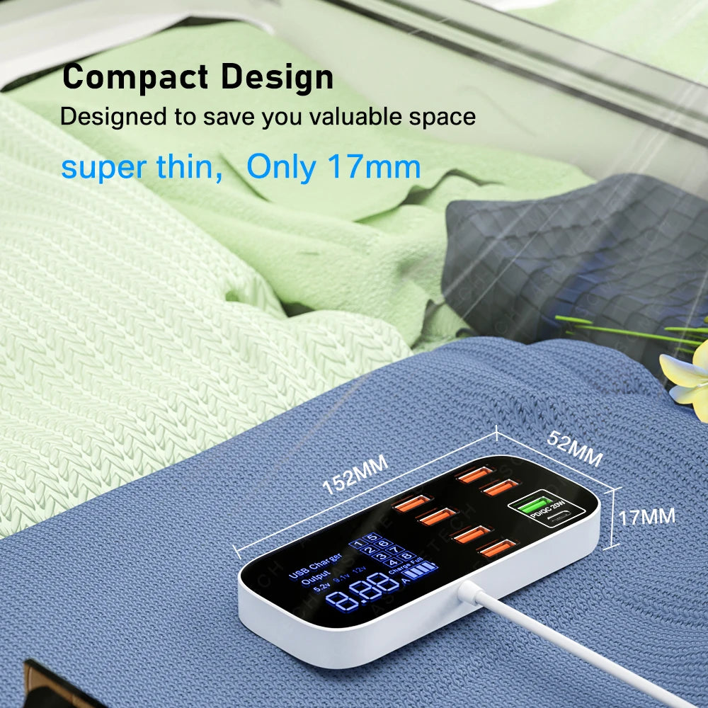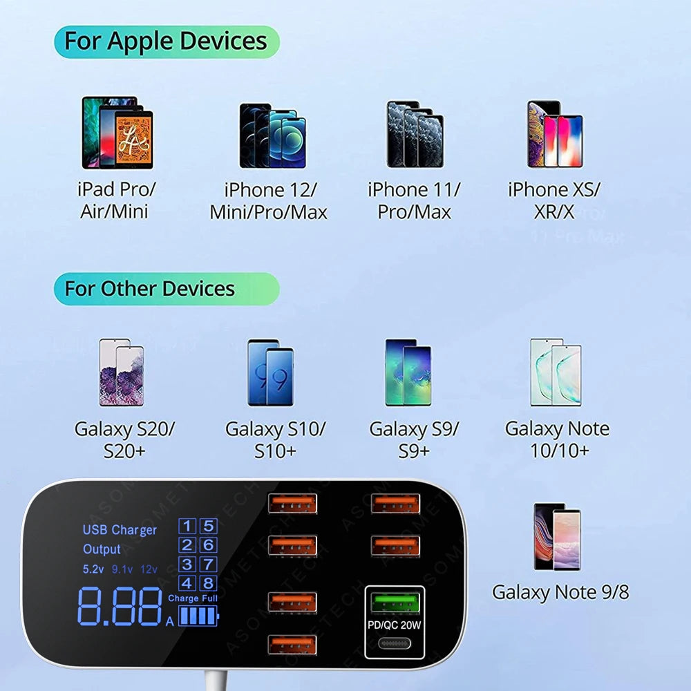 Meet the Powerful 8-Port USB Charger Hub with PD3.0 QC3.0 Fast Charge — a high-capacity charging station engineered for speed, safety, and everyday convenience. Delivering up to 40W of power across eight ports, it lets you charge multiple devices at once without slowing down.